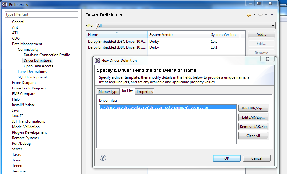 Follow the instructions carefully. There are points where the tutorial doesn't say it all. For example, in the New Driver Definition dialog, I had two lines in the list including "derby.jar" and "C:\Users\russ\dev\workspace\de.vogella.dtp.example\lib\derby.jar" and could not get an activated OK button until I deleted (the shorter) one.