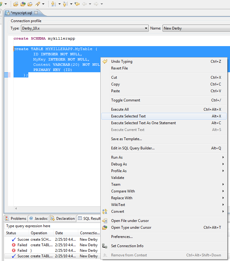 Best is that you select the SQL statement you wish to execute, right-click the selection and choose Execute Selected Text. (Ignore the several status lines you see behind here—I was experimenting to find the best ways of doing things.)