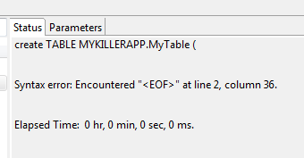 If you leave off the semicolon (except, apparently, for schema-creation), you will get an error. Remember this for executing statements if you leave earlier ones inside the script file.