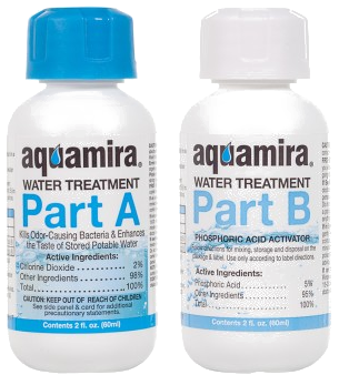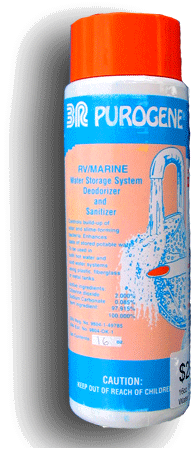 The best and least expensive commercial product I've found is Purogene®. It is chlorine dioxide and imparts no unpleasant taste or odor unlike sodium hypochlorite or straight chlorine. I purchased a 32-ounce bottle of this product, enough to do 960 gallons, for about $50 including shipping from Baytec Containers. The company says it is good for a long time, but doesn't say how long. Since it uses the same active ingredient as Aquamira®, I assume at least 5 years. It's also as easy or easier to use than household bleach. |