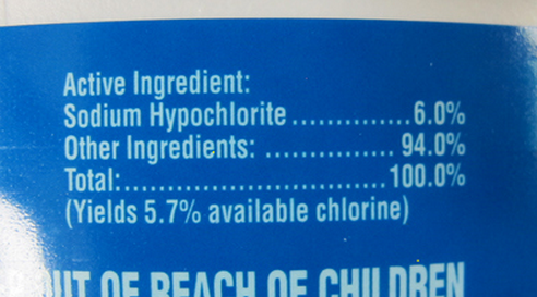 Doesn't this dosage depend on the concentration of chlorine in the store-bought bleach? Yes, it does. You should look for a product label like the one in the illustration below, 6% sodium hypochlorite or 5.7% chlorine. It's from a bottle of Chlorox®. This bottle probably does not contain other things like soap or perfume.